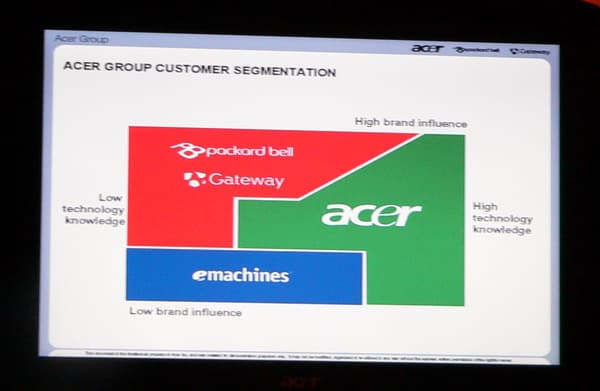 Еще один вопрос, который напрашивается при взгляде на нынешнее многообразие компаний, поглощенных Acer Group, но сохранившихся в качестве самостоятельных брендов. Например, под брендами Packard Bell и Acer продаются внешне и по содержанию очень похожие ноутбуки. Зачем же нужна такая внутренняя конкуренция? Этот слайд вносит некоторую ясность, хотя лишь условно. Например, бренд eMachines ориентируется на тех, кто мало внимания уделяет престижности марки покупаемой техники и даже не особенно интересуется ее характеристиками (бюджетный сегмент?). Под маркой самой Acer сосредотачивается продукция, которая может заинтересовать в первую очередь тех, кто обладает техническими знаниями и выбирает по характеристикам конкретных продуктов. Ну а Packard Bell и Gateway ориентированы на тех, кто смотрит в первую очередь на бренд.