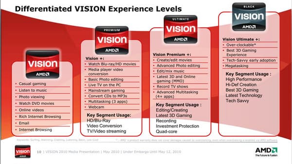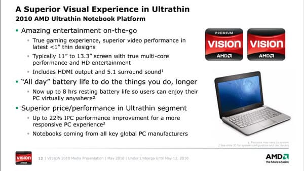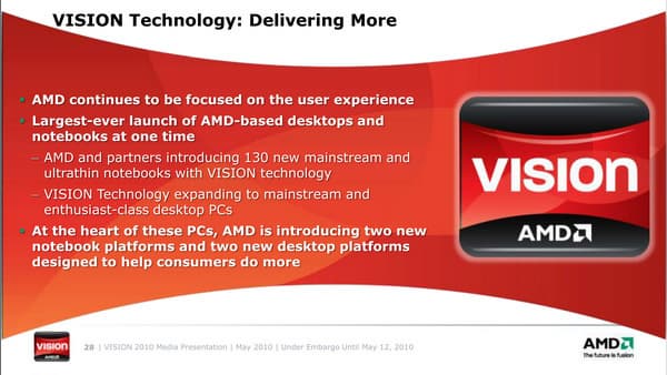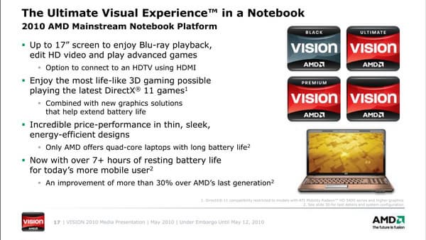 В дни открытия Каннского кинофестиваля компания AMD пригласила группу журналистов со всего мира на презентацию платформы Vision образца 2010 года. Одноименная маркетинговая инициатива стартовала прошлой осенью, и на ноутбуках на платформе AMD с тех пор появились соответствующие логотипы, помогающие покупателям определить: насколько приобретаемая конфигурация производительна, и что от нее можно ожидать в плане взаимодействия с видеоконтентом. И вот, на подходе новые мобильные процессоры, чипсеты, а следовательно и более мощные системы на их основе.