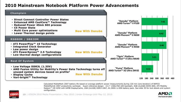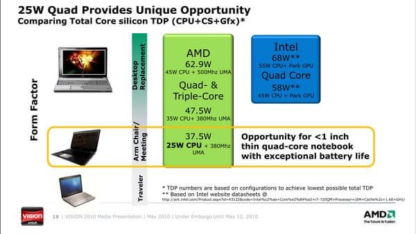 Впрочем, как мы видим на слайде, платформы на основе 35-ваттных N930 (4 ядра, 2 ГГц) и N830 (3 ядра, 2,1 ГГц) также обещают быть весьма экономичными. Вероятно, неплохо в своем классе будет выглядеть и двухъядерная новинка Turion II P520, которую удалось вписать в 25 Вт TDP при частоте 2,3 ГГц.