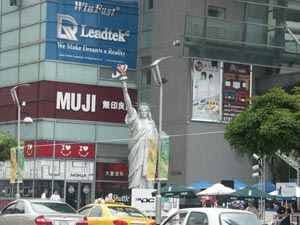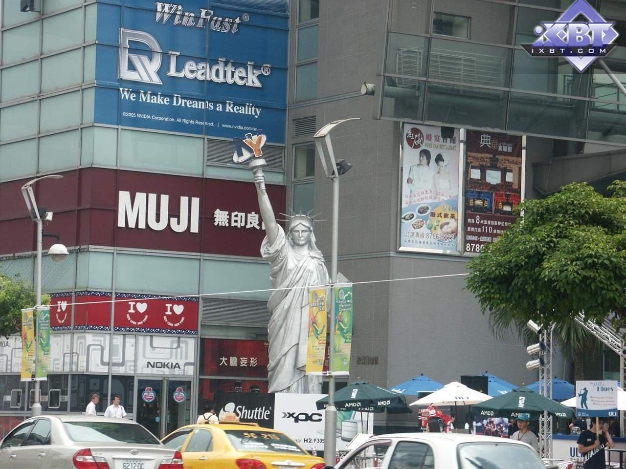 Между тем, дела на выставочном комплексе шли своим чередом... Копия статуи Свободы также призывала ознакомиться с экспозицией, внутри павильонов шла большая агитационная работа девушек в кожаном (язык: китайско-английский, чаще уклон в сторону китайского, поэтому далеко не всегда можно понять, о чем вещает очередная евро-китаянка, хотя и понимать, думаю, не нужно — и так все ясно, агитация за ту фирму, чей логотип носит отважная и бойкая девушка.).