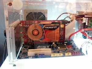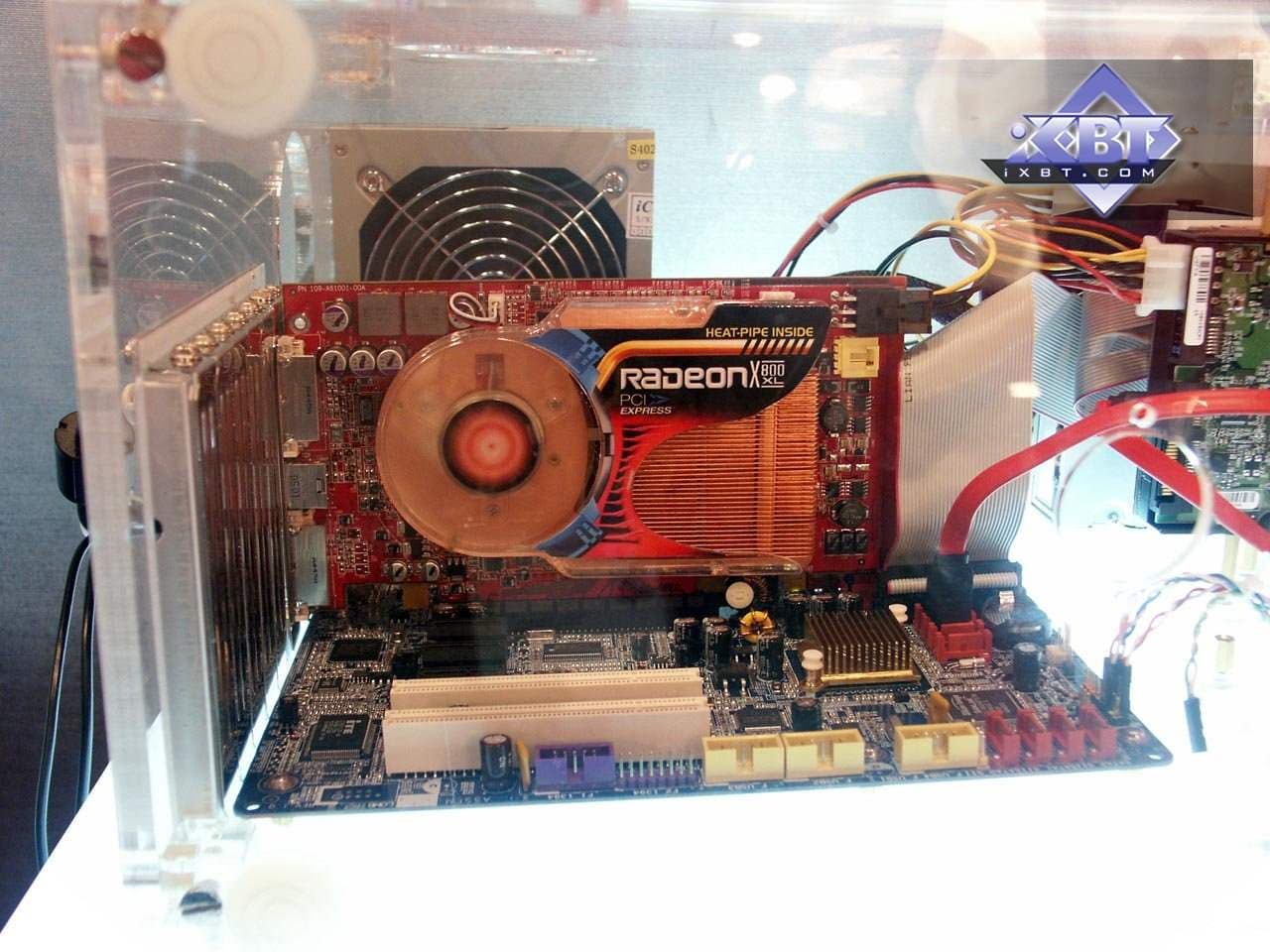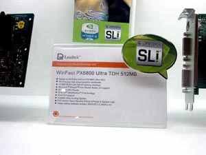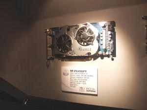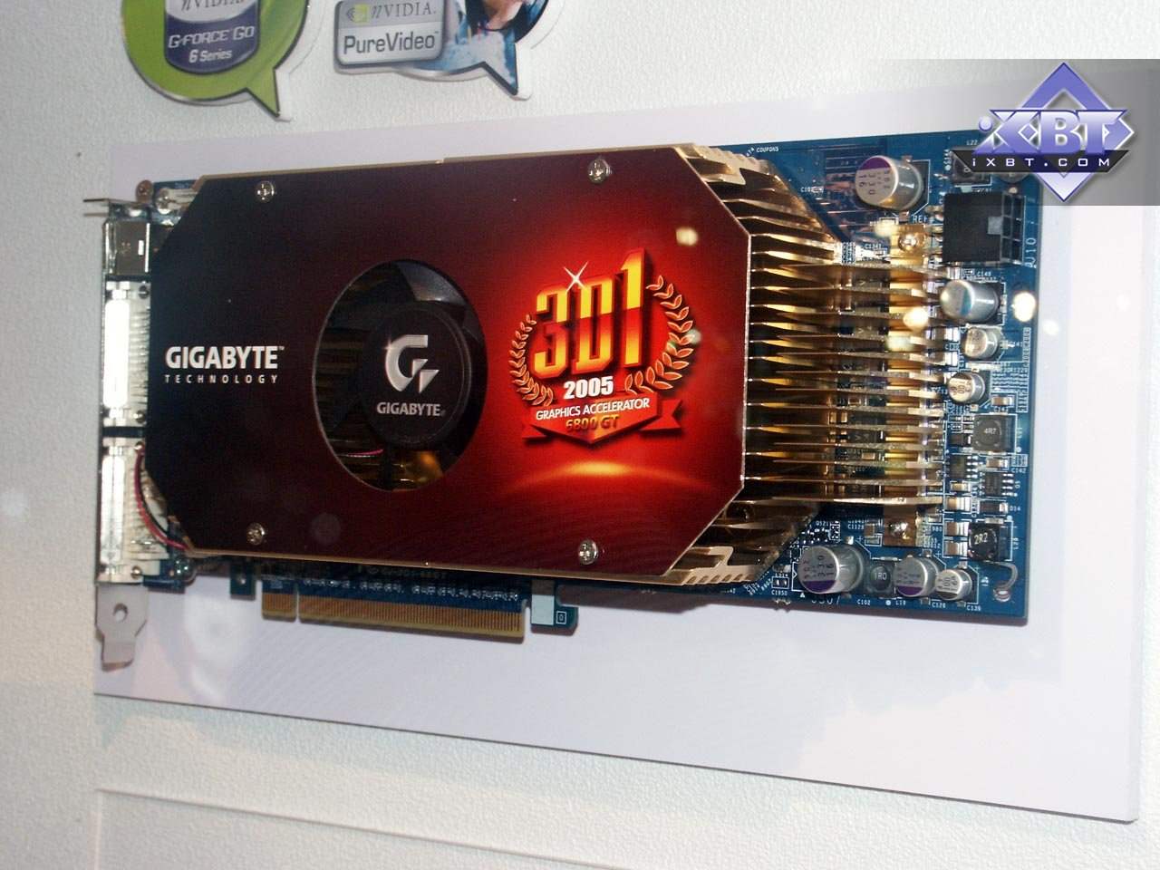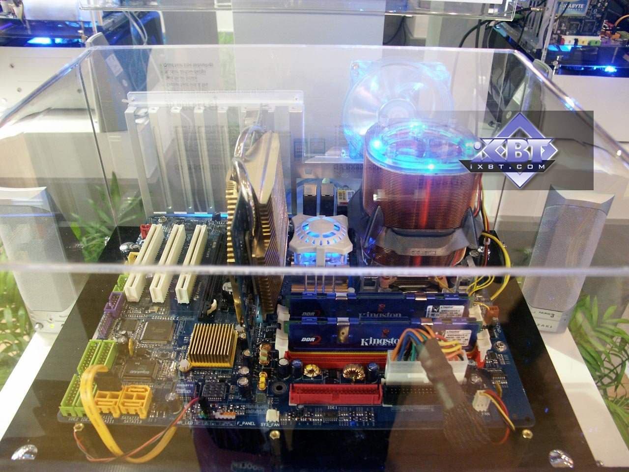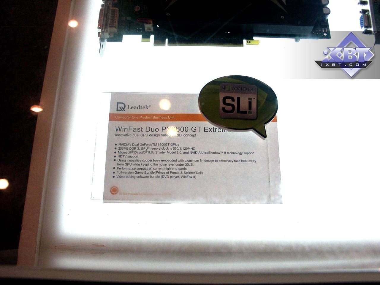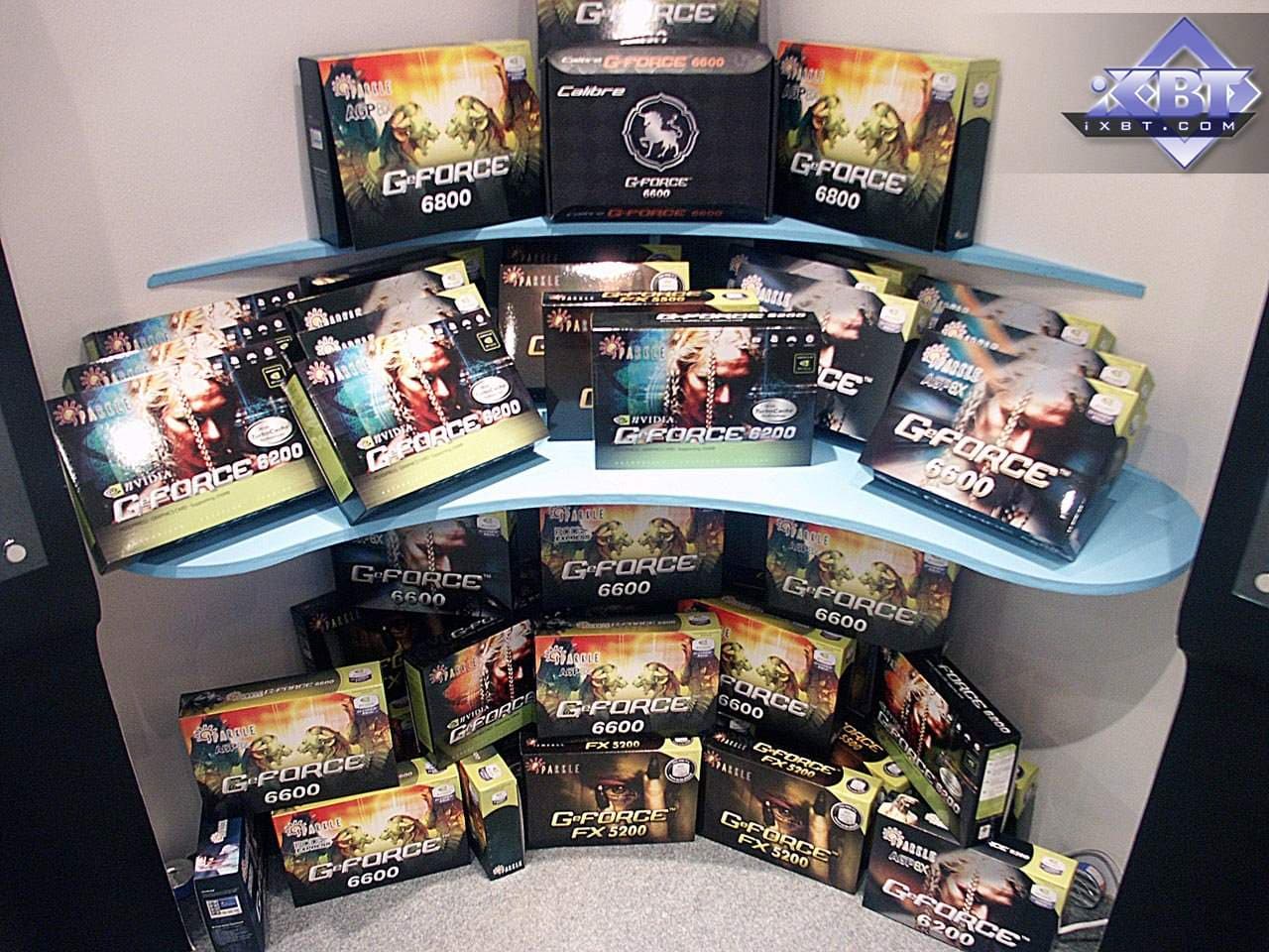 | Опять-таки, подробно о стенде этой компании можно прочитать в уже вышедшем на нашем сайте материале. Я лишь коснусь пары моментов: представлена видеокарта 3D1 но с двумя 6800GT (хотя мне как-то не верится, что на такой PCB разработчики смогли уместить два комплекта и развести 2×256бит. Как говорится, меня гнетут тайные сомнения, что под таким огромным кулером все же скрывается обычный 3D1 на двух 6600GT.) Ну в остальном, стенд представляет большой ассортимент всем хорошо известных системных и видеоплат. | ![]() |
