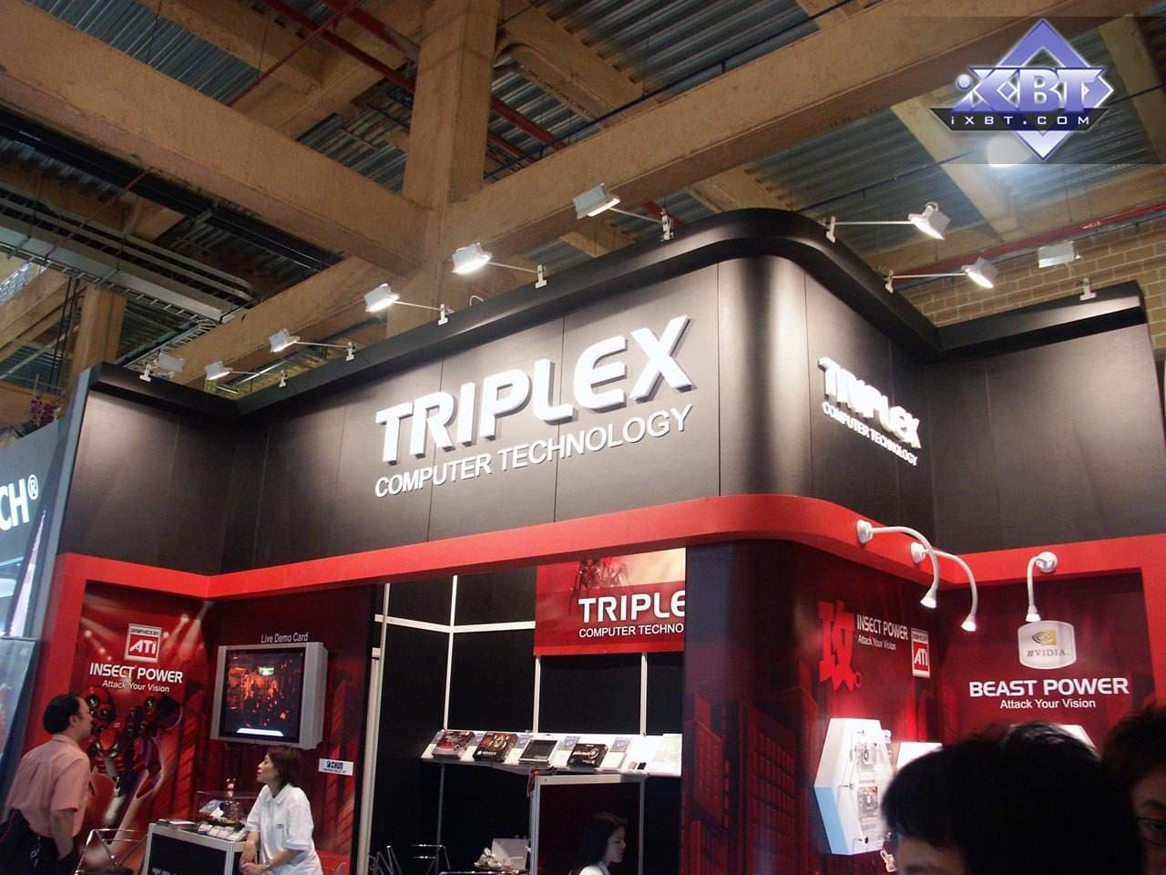 Повстречались еще два стенда со знакомыми именами. К сожалению, ничего выдающегося у них не было. TUL экспонировал из новинок лишь систему с CrossFire. Остальное — копии эталонных карт ATI, что мы давно уже видели. А Triplex, некогда очень известный в России своими серебряными картами, ушел от этого, и его продукция — те же банальные референсы, ничего своего собственного. :( Увы, обидно, что бренды, некогда известные своими изюминками, почти пропали, и стали неинтересными. Интересно, чем компания живет? Только внутренними скудными продажами?