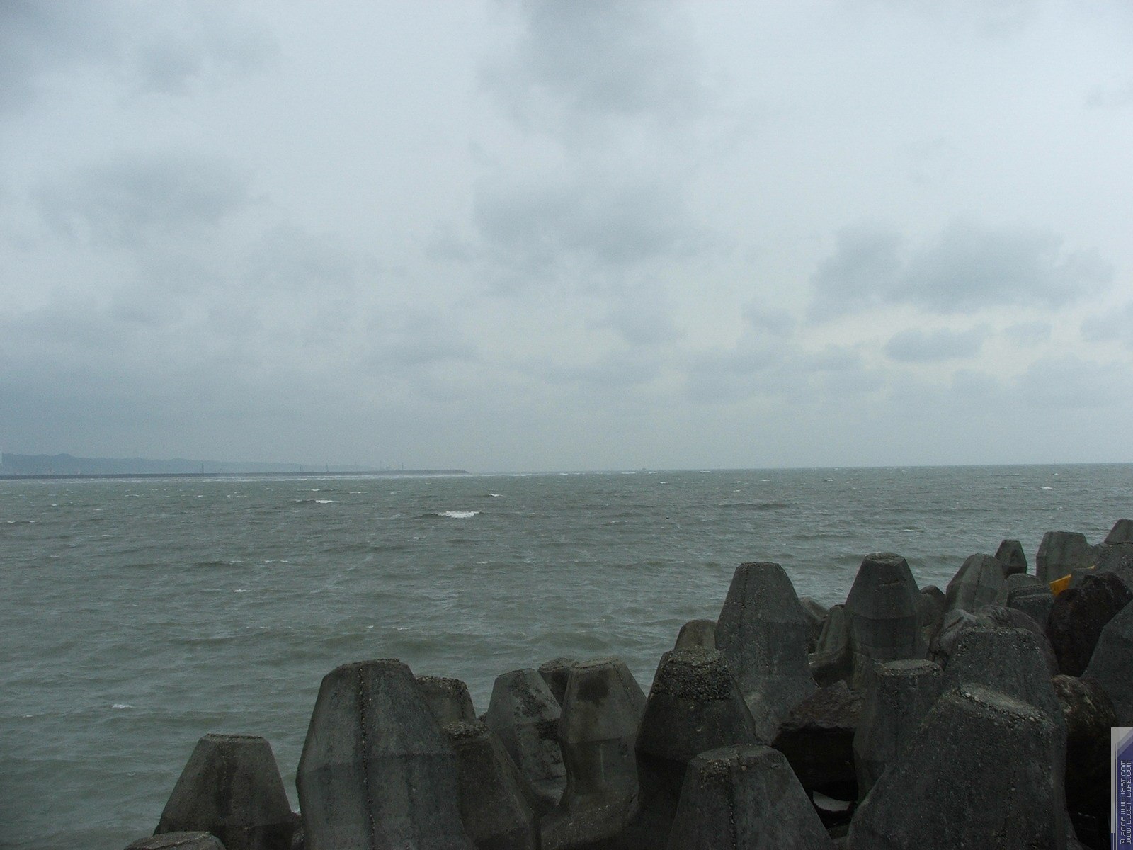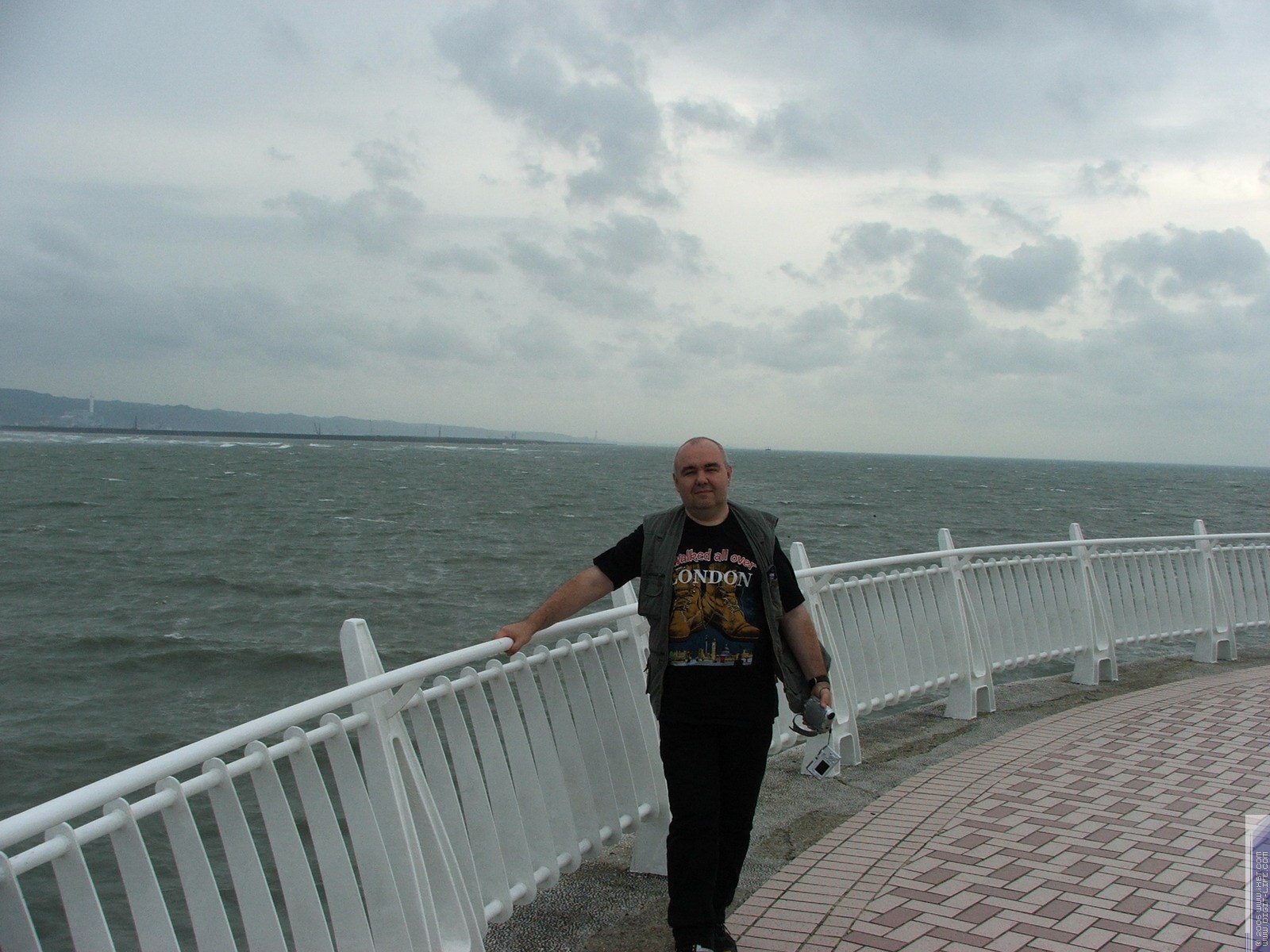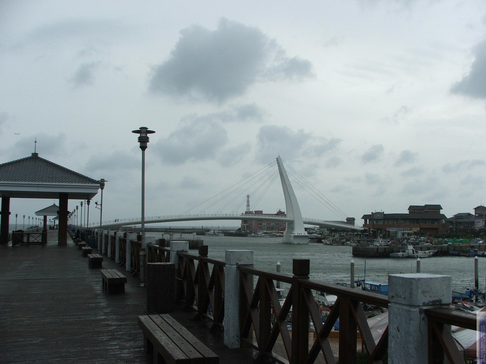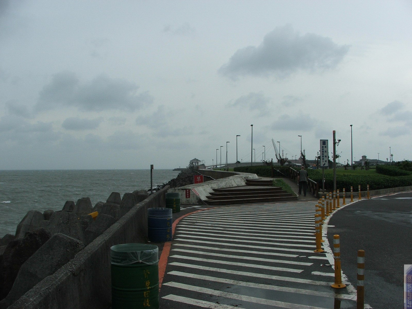 Наконец-то мы попали куда хотели. Вдоль рыбацкой бухточки построен специальный мост-площадка для обзора. Обычно тут можно любоваться закатом в море. Но сегодня пасмурно, плюс ветер очень усилился. Нас буквально сшибало с ног. Даже дождь не чувствовался, капли тут же высыхали от ветра. Но ветер дул поверх моря, поэтому волны были небольшими.