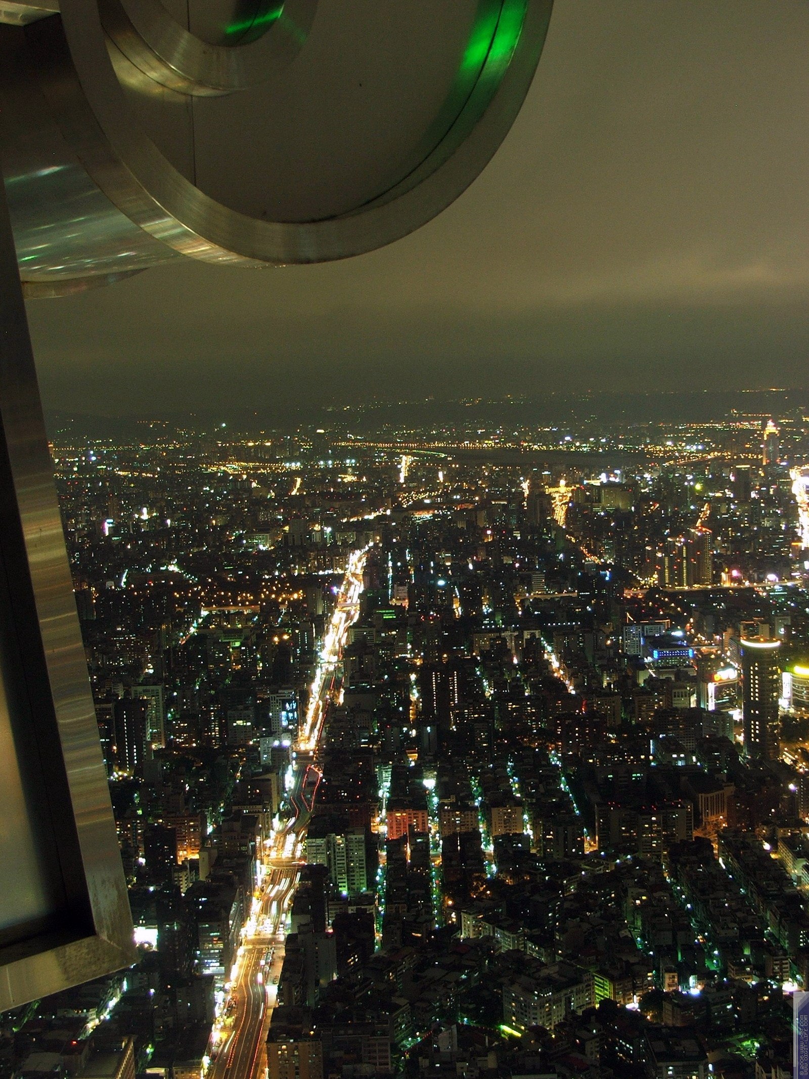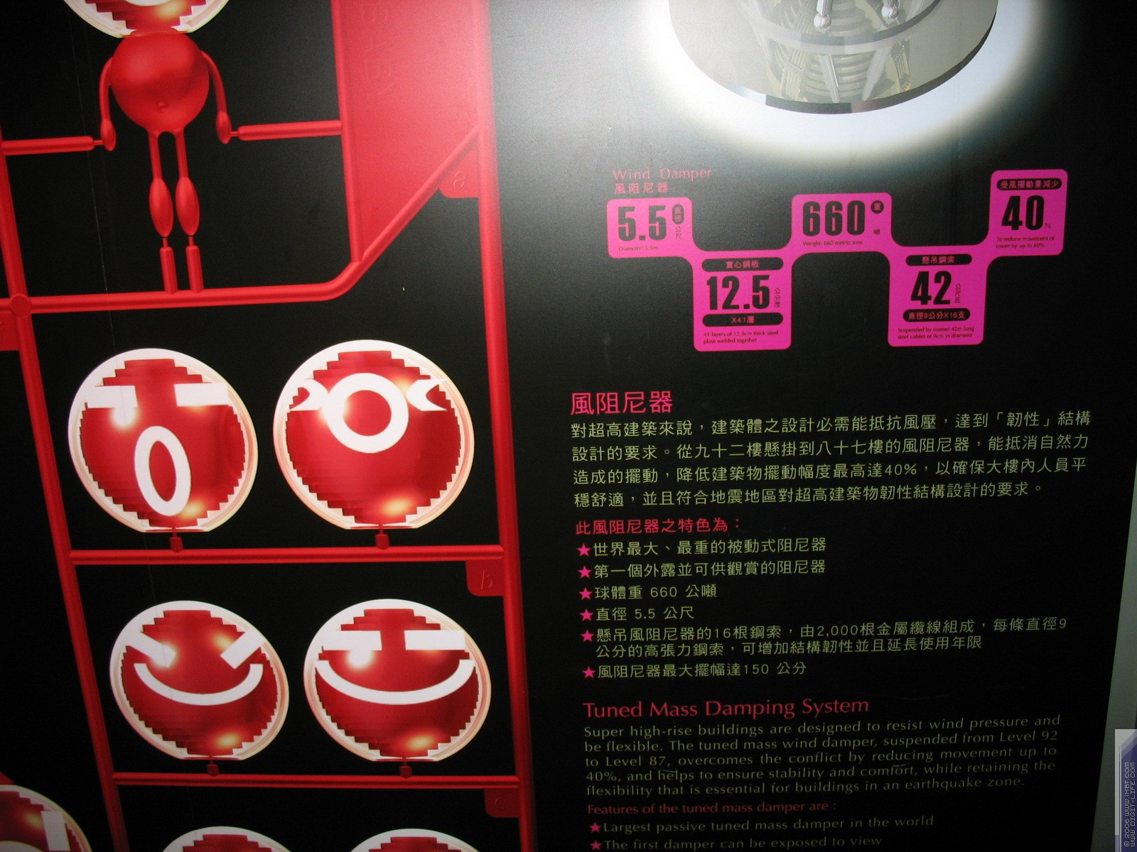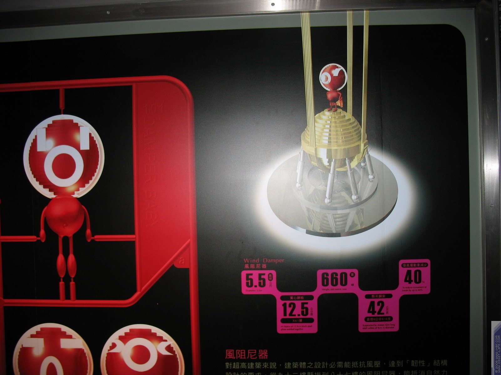 При раскачивании строения (отклонении от вертикали на 6 градусов, демпфер двигается и гасит колебания на 40%. Хотя все равно, как говорили мне знакомые тайваньцы, во время урагана на обзорной площадке лучше не бывать — качается все, и некоторых может мутить и даже укачивать.