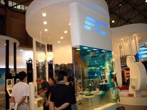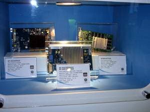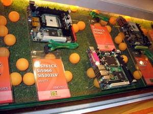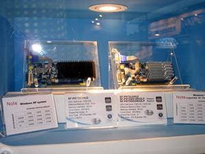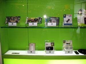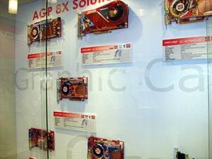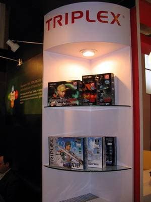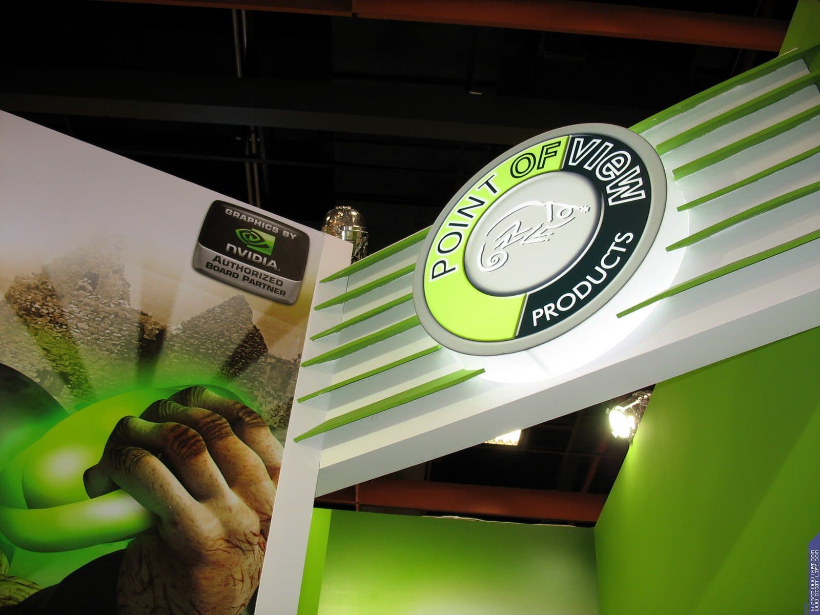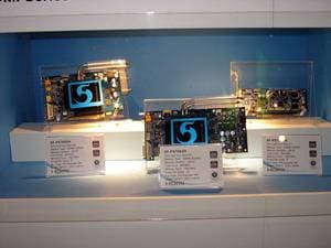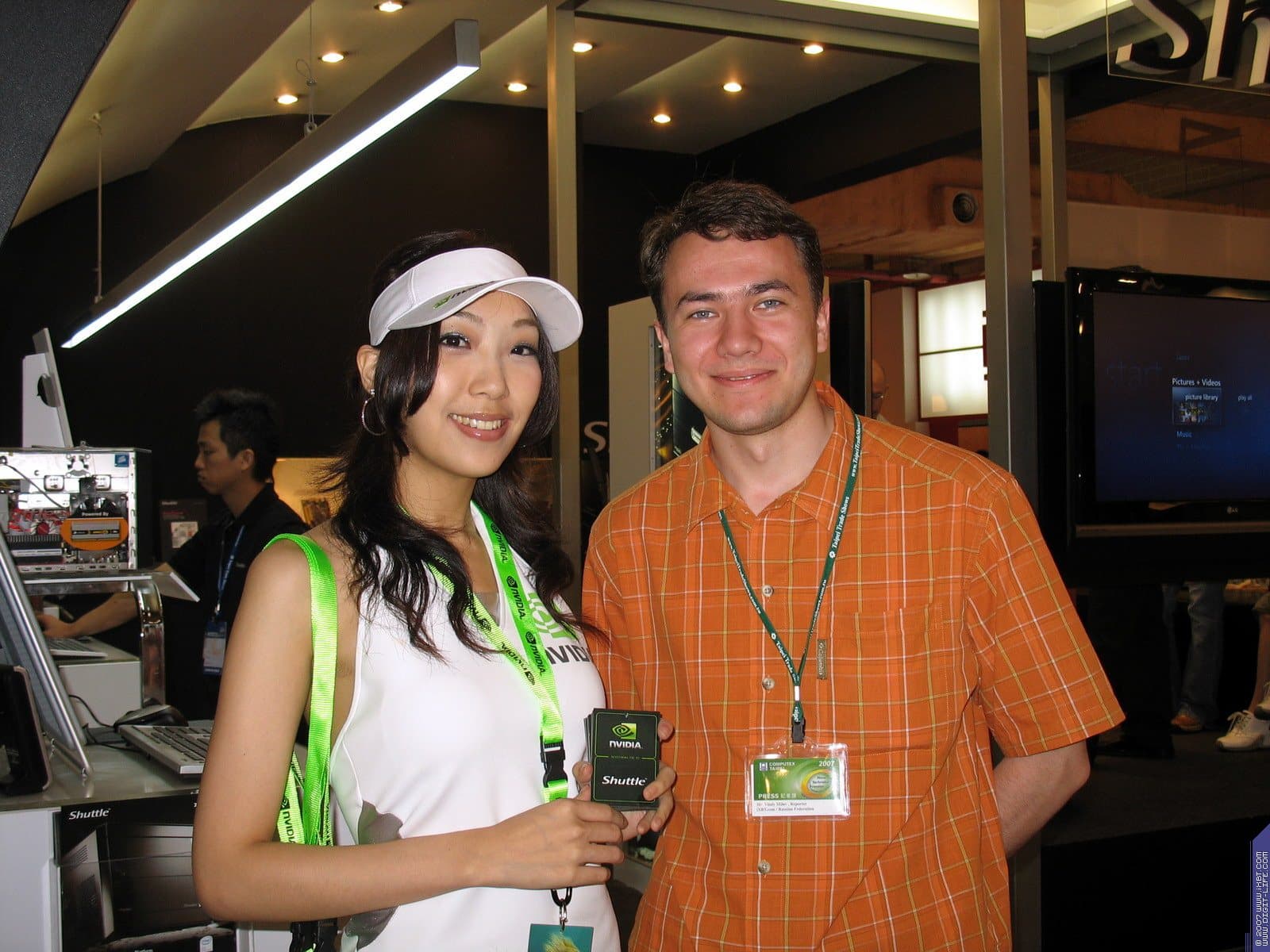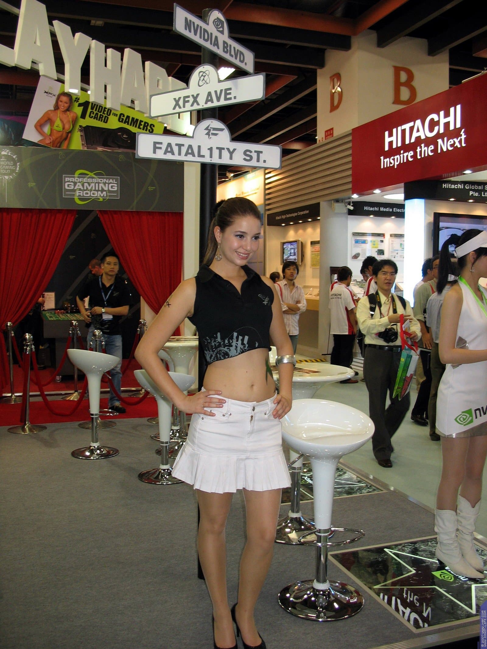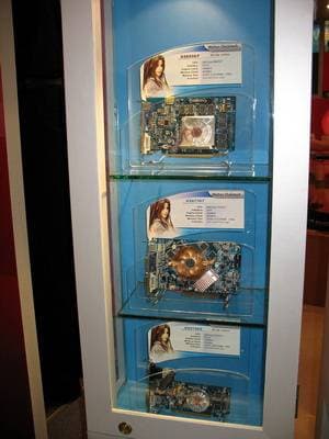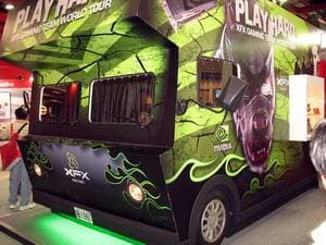 Стенд компании XFX представлял собой некую бронированную машину, окращенную в защитный цвет (тот же цвет — любимый у NVIDIA, что опять неудивительно, если учесть, что XFX выпускает карты на базе процессоров только от калифорнийской компании). Удивительно можно было увидеть на стенде XFX не только видеокарты, но и системные платы. Впрочем, XFX самостоятельно их не выпускает, а закупает по каналам OEM.