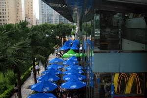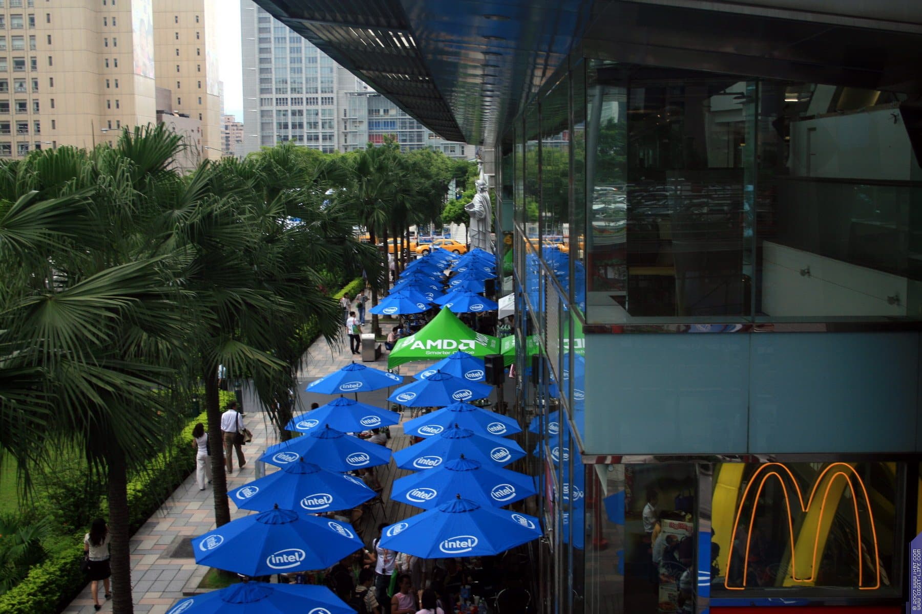 | Кстати о IT-рынке… Количество зонтиков на улице перед одним из павильонов красноречиво говорит о том, какая доля процессоров у Intel, а какая у AMD… :) | ![]() |