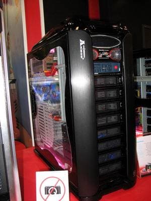Стоит обратить внимание на два новых корпуса, представленных компанией (их даже запрещено фотографировать, однако автор фотографий об этом узнал только тогда, когда эти снимки уже обрабатывал :-). Разработчики продолжают линию плавных поверхностей лицевой панели, традиционно конструируют окно в боковой дверце. Другой вариант расчитан на монтаж большого числа накопителей, при этом с возможностью охлаждения каждого из них.