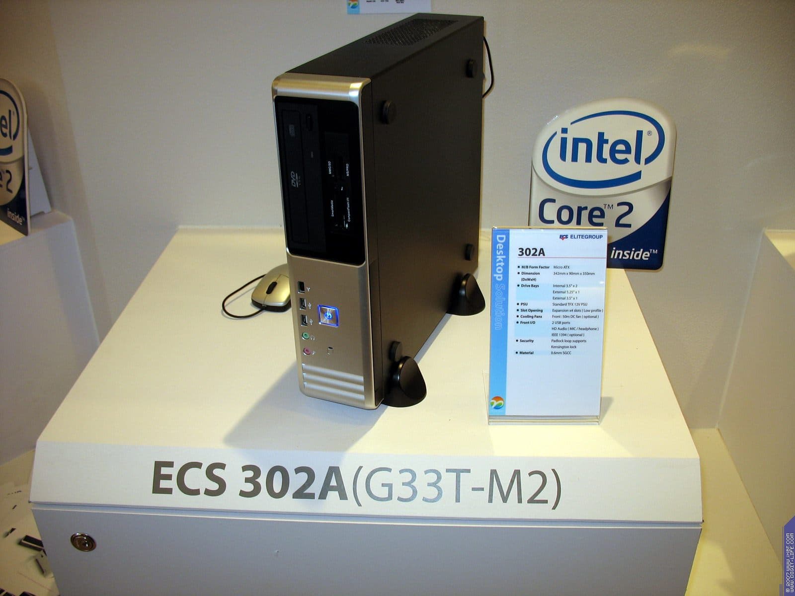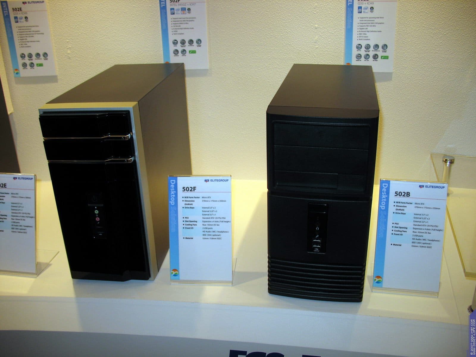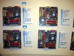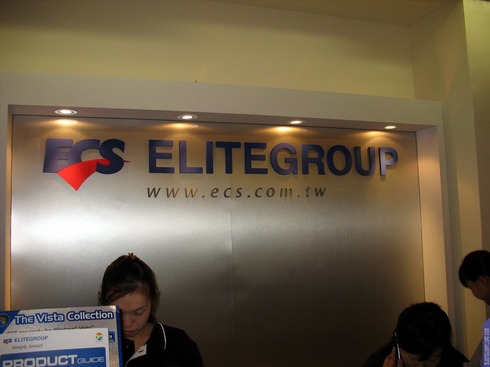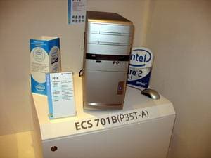 В том же павильоне, но двумя этажами выше, располагался гигантский павильон компании ECS/Elitegroup, которой в этом году исполнилось 20 лет. Безусловно, самый богатый и просто колоссальный ассортимент у фирмы — среди системных плат. Просто глаза разбегаются от обилия видов, типов, марок. По словам представителей компании нет ни одного чипсета, ни одной шины, ни одного форм-фактора, который бы не поддерживался бы ECS в их материнских платах. Причем, от самых дешевых и бюджетных, вплоть до очень дорогих с шикарным комплектом.