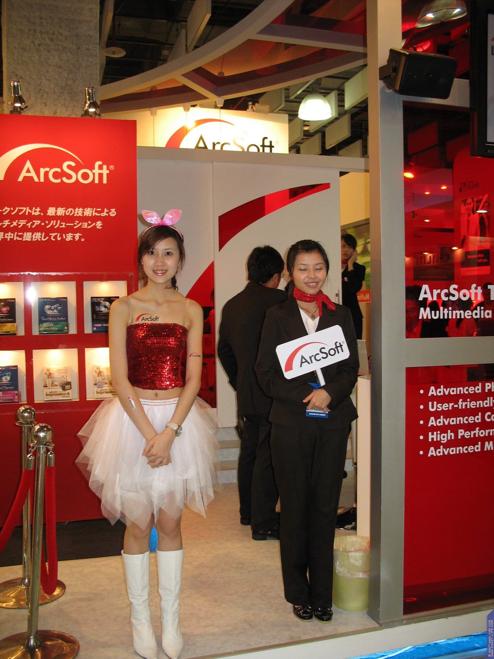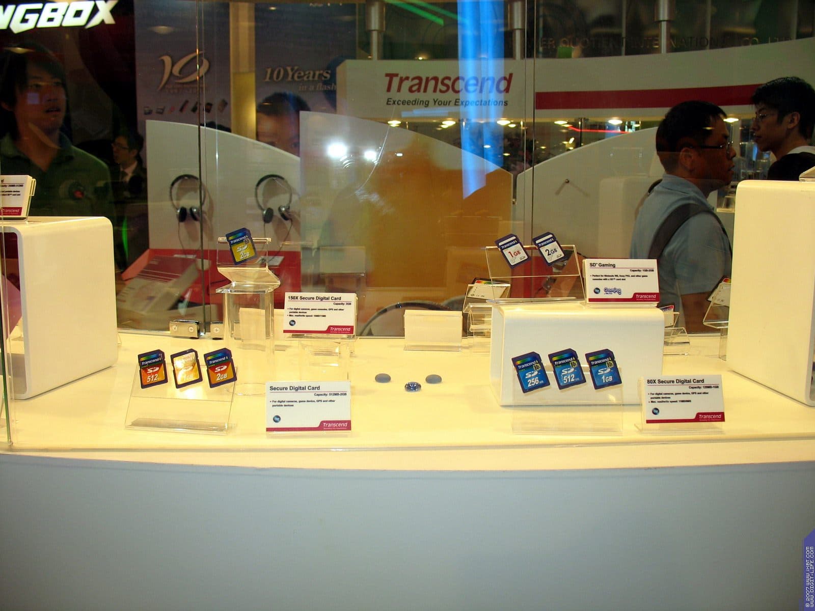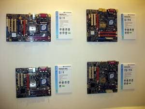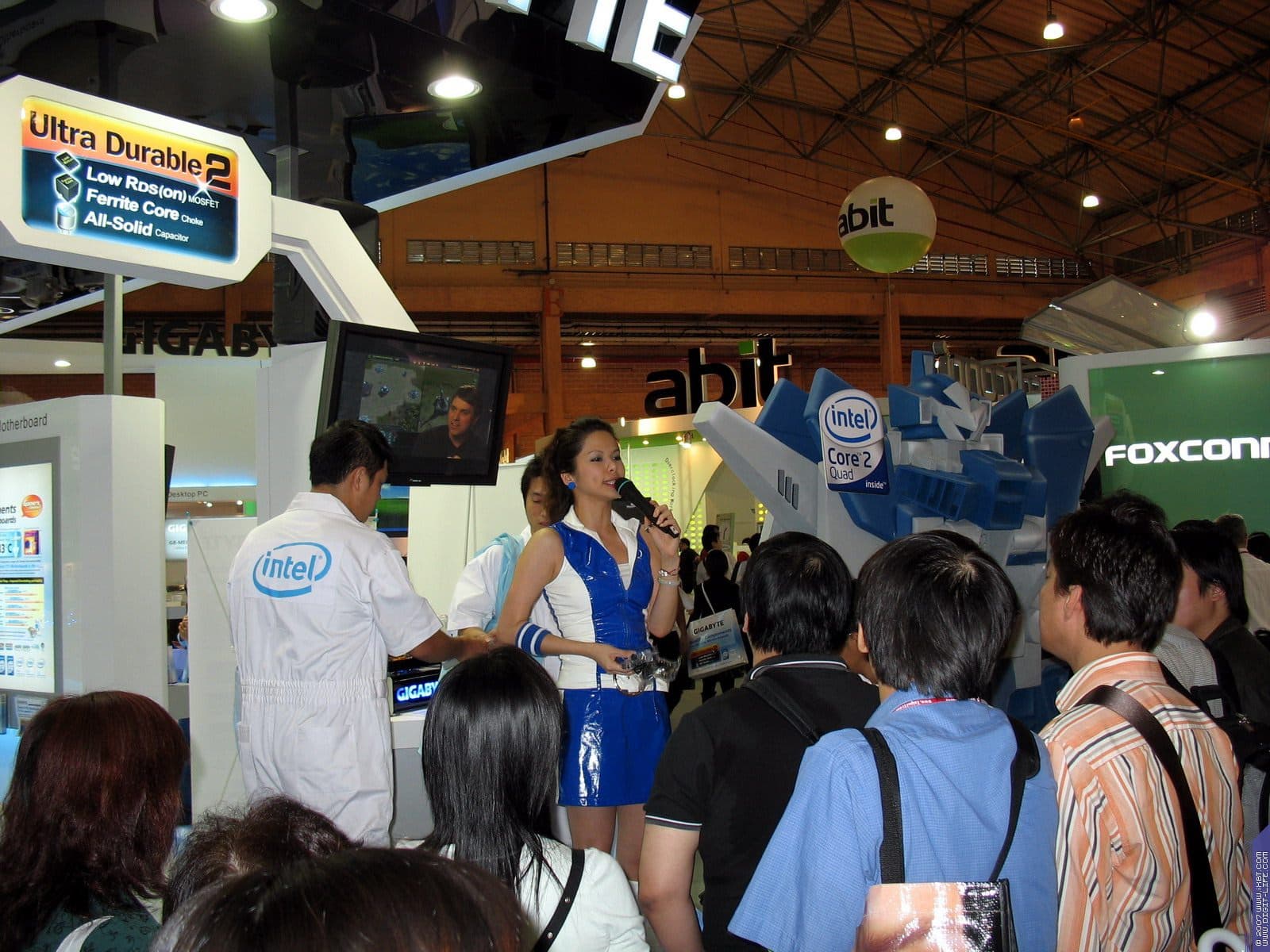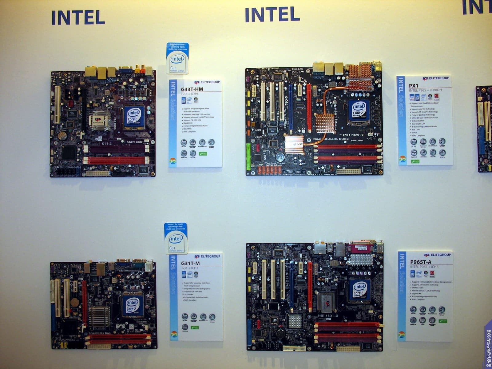В том же павильоне, но двумя этажами выше, располагался гигантский павильон компании ECS/Elitegroup, которой в этом году исполнилось 20 лет. Безусловно, самый богатый и просто колоссальный ассортимент у фирмы — среди системных плат. Просто глаза разбегаются от обилия видов, типов, марок. По словам представителей компании нет ни одного чипсета, ни одной шины, ни одного форм-фактора, который бы не поддерживался бы ECS в их материнских платах. Причем, от самых дешевых и бюджетных, вплоть до очень дорогих с шикарным комплектом.