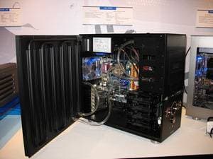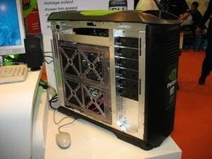 В предыдущем репортаже мы говорили про компанию Coolermaster, однако наиболее интересным экспонатом можно назвать концепцию для NVIDIA, которая подразумевает установку внутри системника до 4-х видеокарт в режиме SLI. При этом размеры корпуса увеличиваются лишь в глубину (чтобы полноценно охлаждать отдельный блок с HDD), когда как высота и ширина - в рамках привычного.