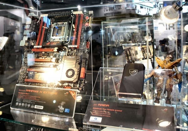 Вот он на стенде рядом с еще одной материнской платой Rampage IV Extreme.
