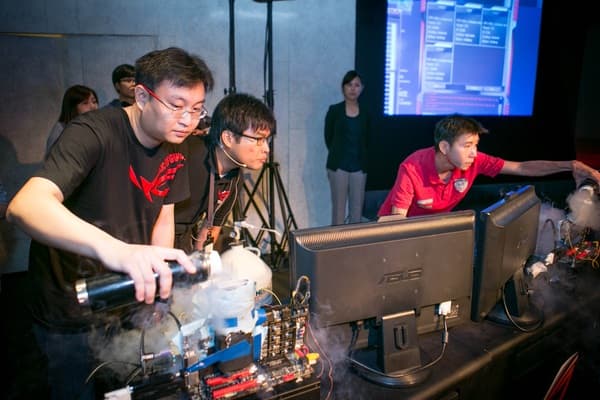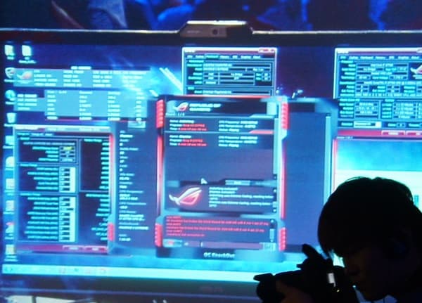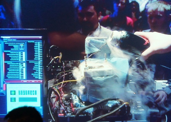 Прямо на презентации приглашенные оверклокеры провели небольшой сеанс разгона. Впрочем, вживую ничего не было видно, приходилось смотреть на экран, куда транслировали картинку с видеокамеры: