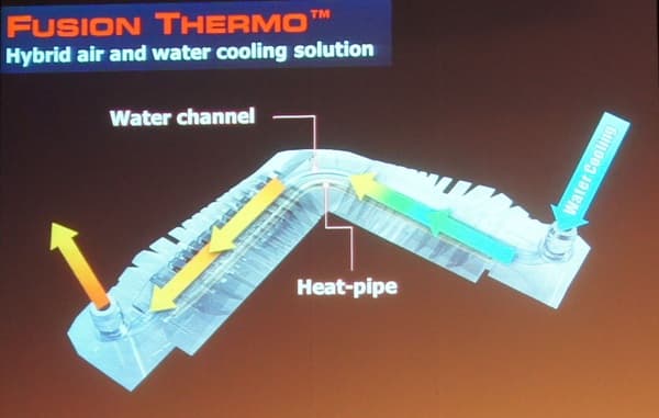 Помимо других особенностей, перечисленных на слайде выше, в ней использована новая версия охлаждающего контура, сочетающего в себе черты систем воздушного и жидкостного охлаждения.