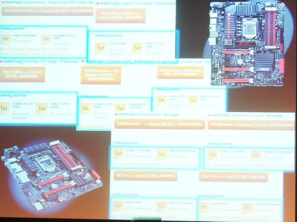 К сожалению, на слайде лишь очень неразборчиво видно, в каких именно. Но, например, оверклокер Андре Янг, используя эту плату и Radeon HD 7970 (1500/1800 МГц), добился результата в 253 506 очков в 3DMark’03 и 66 344 в 3DMark’05 (только там видеокарта имела частоты 1610/1800 МГц). В Unigene Heaven Xtreme Preset он же добился результата в 7943,57 очков (3 видеокарты Radeon HD 7970 на 1500/1800 МГц) и т. д.