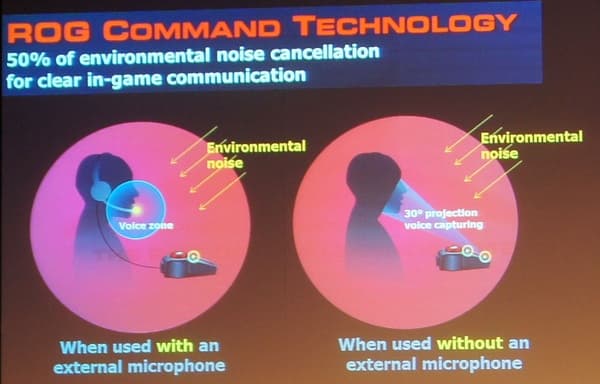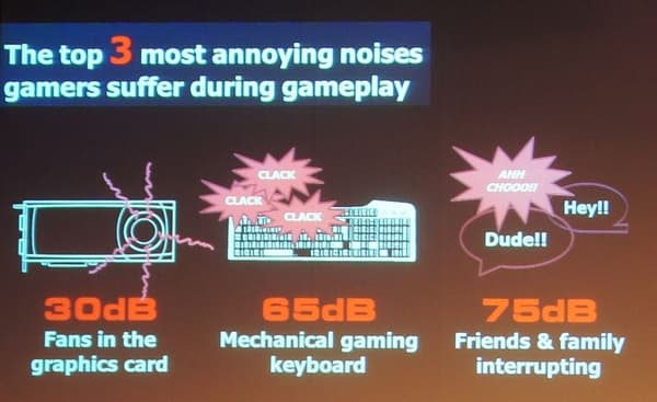 В ASUS выделили три типа наиболее раздражающих звуков, которые отвлекают во время игры: шум вентиляторов, щелчки клавиатуры и посторонние разговоры вокруг. Хотя, конечно, шумов вокруг гораздо больше. Все эти шумы мешают переговариваться и раздражают.