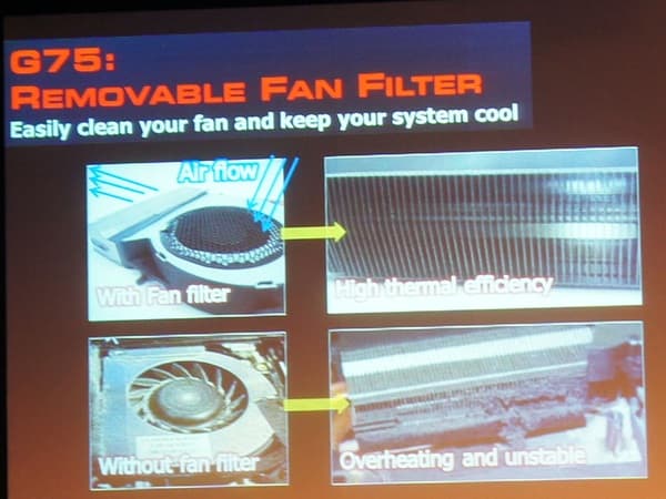 В модели G75 ASUS предлагает новый фильтр, который должен задерживать пыль, так что внутренности ноутбука и его радиаторы останутся чистыми. Фильтр съемный, то есть его можно снять и промыть. Хотя для этого все равно придется снимать основную крышку на дне ноутбука.