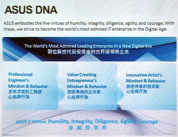 Отдельный слайд был посвящен такому модному в последнее время у азиатских компаний понятию, как «ДНК бренда». Компания объединяет стремления инженеров, прогрессивных художников и предпринимателей для того, чтобы создать лучший на рынке продукт.
