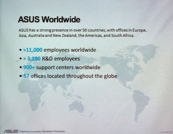 По всему миру на компанию ASUS работает более 11 000 человек, из которых более 3100 — это инженеры, участвующие в процессе исследований и разработок. Компания имеет 900 центров технического обслуживания и 57 офисов по всему миру.
