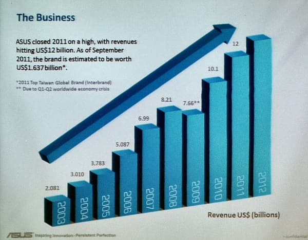 2011 год компания закончила на мажорной ноте, объем доходов превысил 12 млрд. долларов. К сентябрю 2011 года стоимость брэнда ASUS оценивалась в 1637 млрд. долларов.
