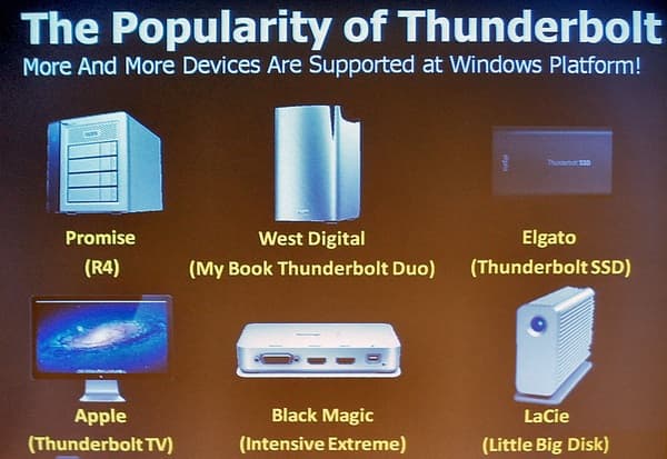 Последний слайд как раз и был посвящен тому, что устройств Thunderbolt на рынке становится все больше и больше. Правда, немного смущает сам факт, что в этом приходится убеждать на презентации — недостаточно сфотографировать полку в магазине. Однако какого-то заметного уровня присутствия на рынке Thunderbolt непременно достигнет, а вот окажется ли интерфейс жизнеспособным в длительной перспективе — увидим.