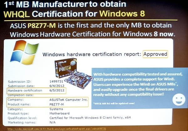 ASUS P8Z77-M стала первой материнской платой, получившей сертификацию Microsoft для Windows 8.