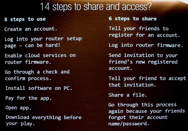 Насколько я понял из презентации, ключевая «облачная» технология в понимании ASUS — это возможность получить доступ к собственному роутеру ASUS и устройствам за ним через интернет. С функциональной точки зрения основными возможностями должны стать удаленная работа с собственными файлами (включая мультимедиа), а также возможность легко предоставить доступ друзьям, дав прямую ссылку, чтобы и они могли послушать музыку, посмотреть фильм и пр. Кроме того, поддерживается возможность синхронизации между несколькими «облаками», сделанная, я так понял, для возможности быстрого обмена контентом с друзьями.
