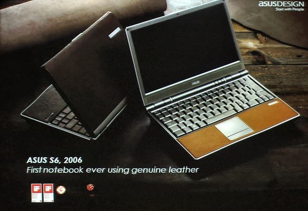 ASUS S6 — первый ноутбук в мире, использующий кожу в качестве материала отделки. Специфический материал потребовал больших усилий для того, чтобы сделать его пригодным к использованию: он не должен портиться от пота (ведь ноутбук носят в руках и часто кладут потные руки на клавиатурные подставки), должен быть устойчив к температурным колебаниям (ноутбук ведь нагревается при работе), не должен коробиться, терять форму и т. д.