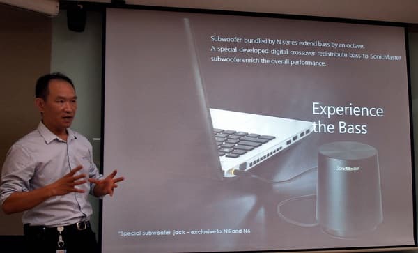 Когда на рынке появилось новое (предпоследнее) поколение ноутбуков мультимедийной серии N, в нем было представлено новое и технически необычное решение — внешний сабвуфер, подключающийся к ноутбуку проводами. Внешний сабвуфер получился размером где-то с кружку, т. е. еще портативен, но уже ни при каких условиях не влезет в корпус. Вынеся сабвуфер «за скобки» (т. е. из корпуса), компания решила сразу большое количество проблем, в первую очередь связанных с дефицитом места. Но при этом породила много новых: такой сабвуфер не всегда удобно держать на столе, по столу тянется лишний провод, да и когда берешь ноутбук с собой, приходится еще и провод сабвуфера отключать, что неудобно.