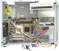 Провода, идущие от разъема питания и переключателя напряжения к блоку питания, натянулись. Для продолжения процесса необходимо вытащить планку, на которой крепится разъем питания и переключатель, и больше ничто не помешает добраться до внутренностей PC.