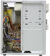 Итак, спереди два внешних 5-дюймовых отсека и один внешний 3-х дюймовый. Еще один внутренний для установки жесткого диска расположен над внешним 3-х дюймовым, а снизу слева, прикреплен блок питания. Его геометрические размеры можно оценить по вентиляционным прорезям. Пожалуй, интересней будет рассматривать его сбоку.