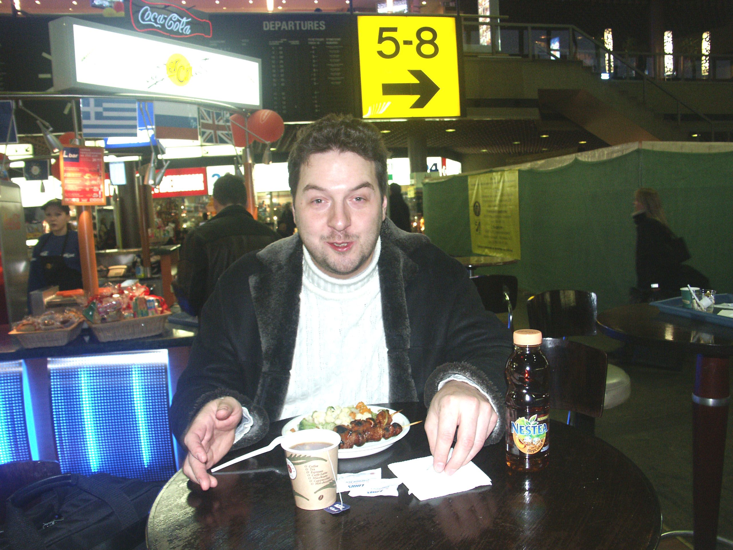 | Вылет из Москвы был назначен на 11:15, поэтому уже в 7:30 мы уже выехали в аэропорт Шереметьево-2. Мне очень помог Кирилл Кочетков, наш главред журнала, который меня подвез в аэропорт, да и там еще с ним немного скоротали время, заодно и перекусили :) |