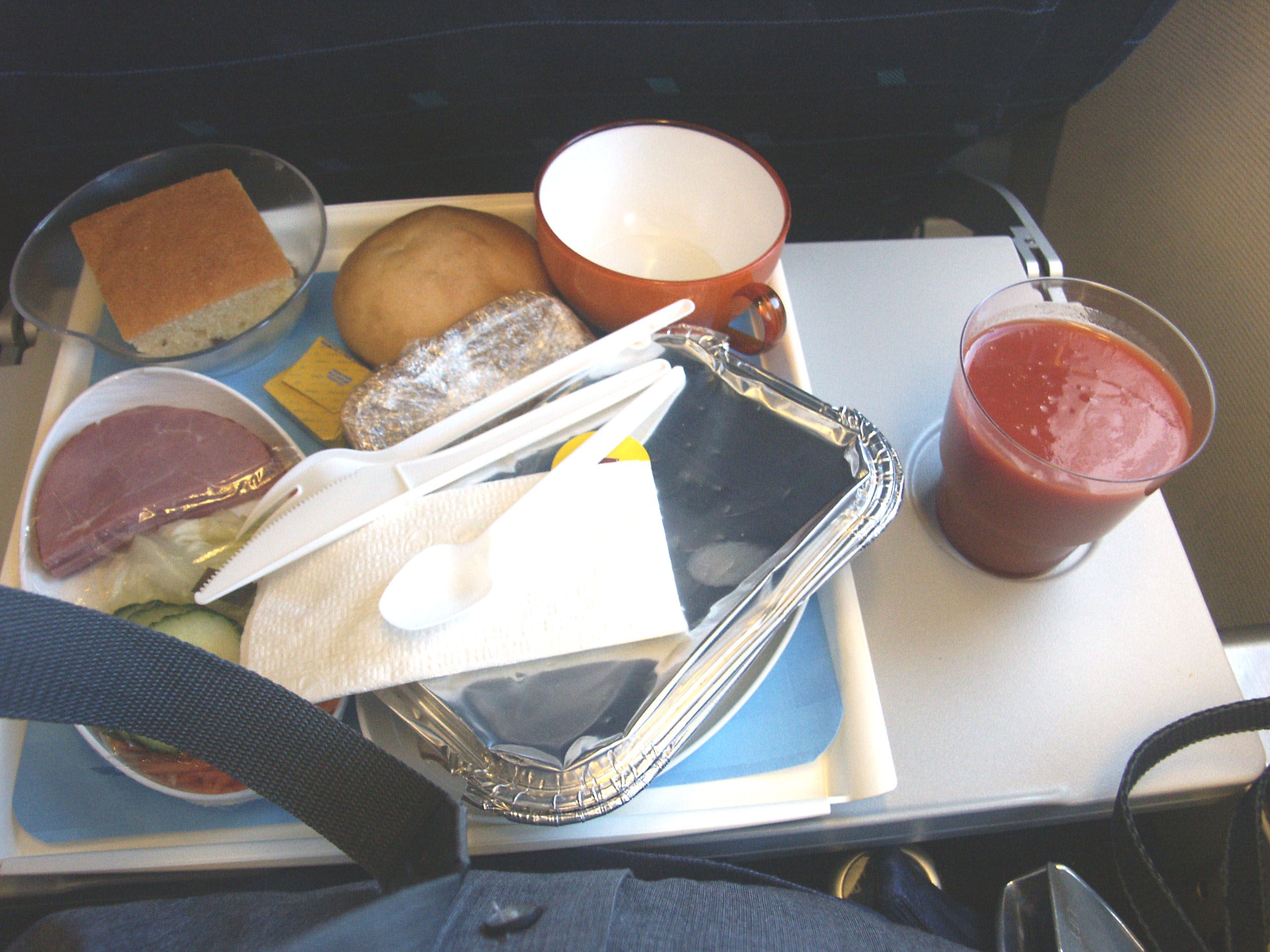 Когда небо снова начали застилать облака, в этот удачный момент (и неудачный для съемок того, над чем мы летим — на снимке слева) нам принесли обед (на снимке справа)