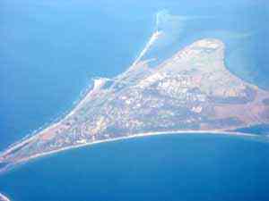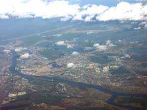 | А это мы пролетаем над Ригой, видна река Даугава, множество мостов, из них один (самый близкий к морю) — подвесной. Впереди виднется знаменитое Рижское взморье. |