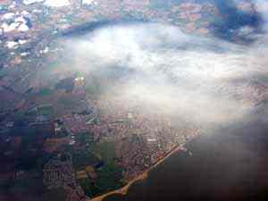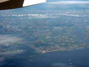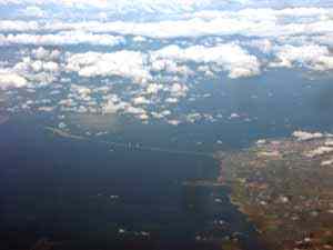 | Мы перелетели Балтику и пролетаем над южной оконечностью Швеции, в местечке Мальме находится огромная эстакада, построенная над проливом, разделяющим Швецию и Данию (на снимке справа). Внизу слева — виден сам город Мальме, а внизу справа — причудливой формы полуостров Сканер, которые южнее Мальме. |