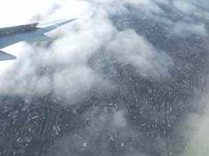 При подлете к границам зарубежной, так сказать, западной европы (Латвия) облака начали уже давать бреши (с земли уже видны просветы с солнечными лучами) — на снимке слева. А потом и вовсе облака стали все более редкими (на снимке справа).