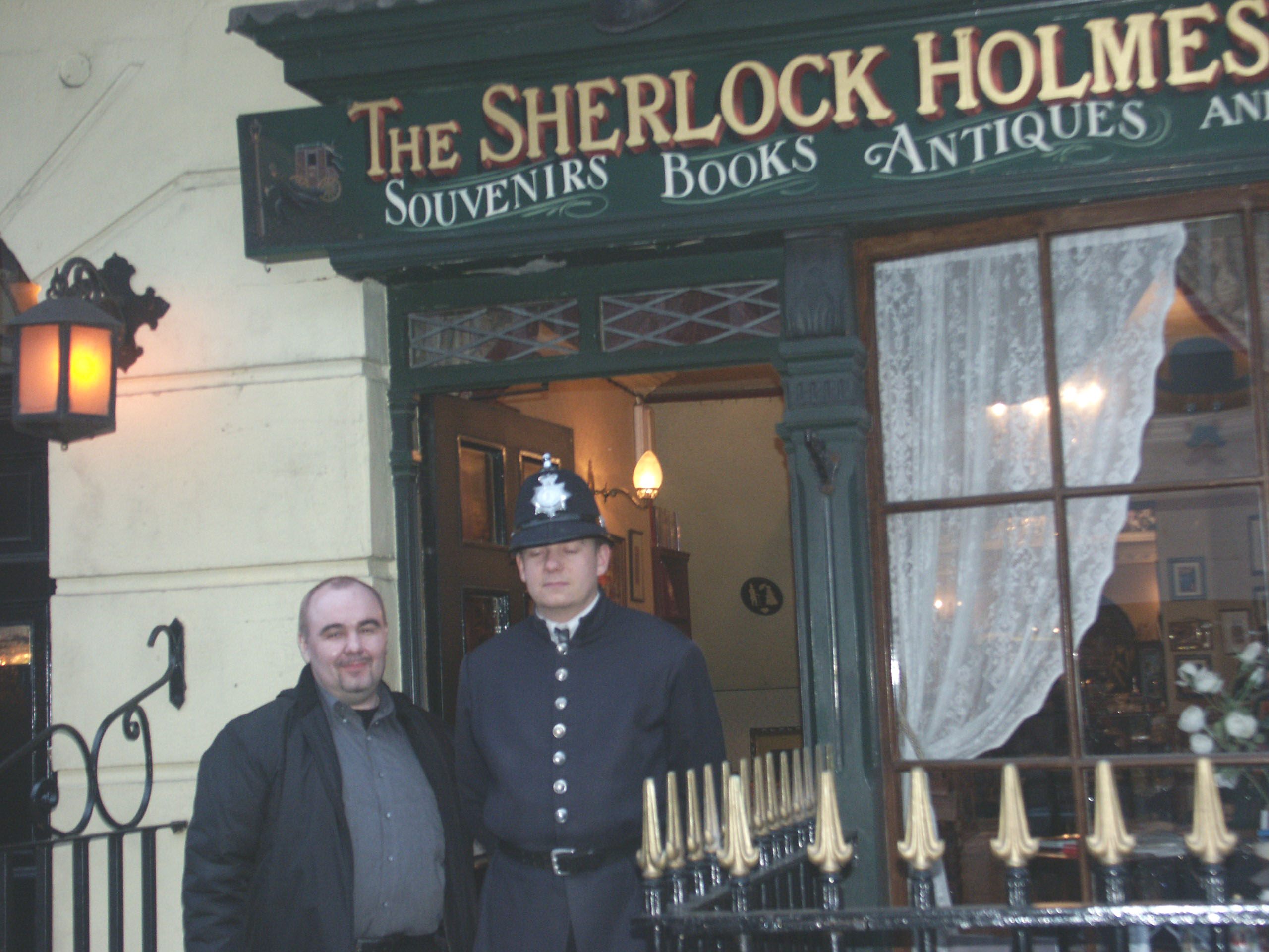 | Вот мы и у входа в музей Шерлока Холмса и доктора Ватсона. Местный полицейский любезно соглашается сфотографироваться с нами. |