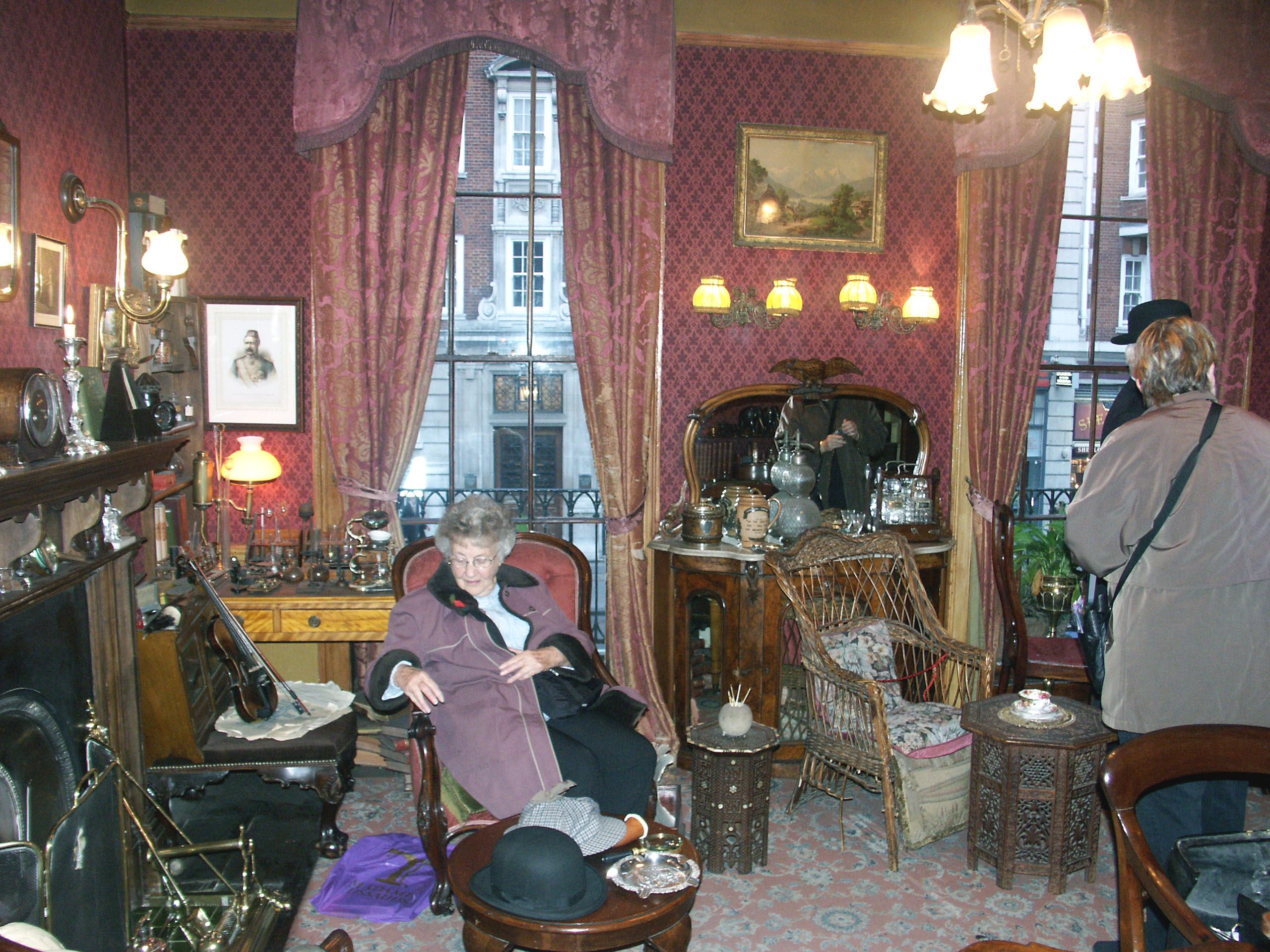 | В гостиной можно встретить хранителя музея, который представляется всем как доктор Ватсон, и одет по моде конца 19-го века. |
