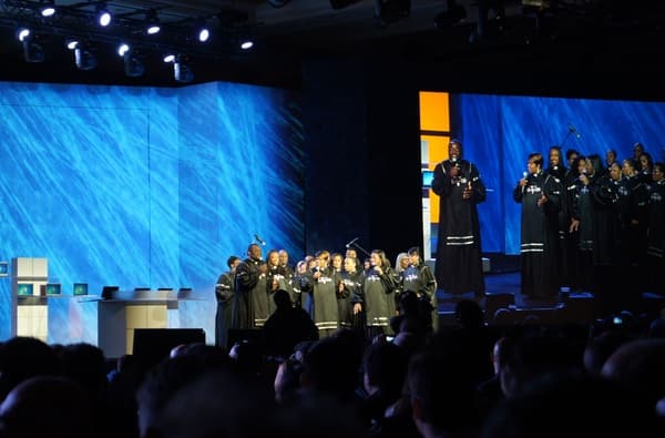 Далее, в кратком перерыве, выступил негритянский хор (поющий в стиле, кажется, Gospel), который пропел сообщения из твиттера по поводу выступления. Американским коллегам выступление хора очень понравилось. А мы переходим к самой, пожалуй, интересной части выступления — к разговору о новых возможностях игровой консоли Xbox 360.
