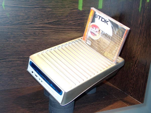 Достаточное внимание компания TDK уделяет и внешним CD-RW-дисководам. На CeBIT были представлены две модели рекордеров со скоростными характеристиками 24/10/40 и 32/10/40. Более громоздкое тридцатидвухскоростное устройство поддерживает интерфейсы IEE 1394 и USB 2.0. Кроме того, данный аппарат способен выполнять функции подставки для… нет, не кофе (хотя, надо еще проверить, как у сего девайса обстоит дело с подогревом), а для дисков. Это стало возможным за счет оснащения верхней поверхности дисковода специальными отсеками под размер стандартного jewel-case.