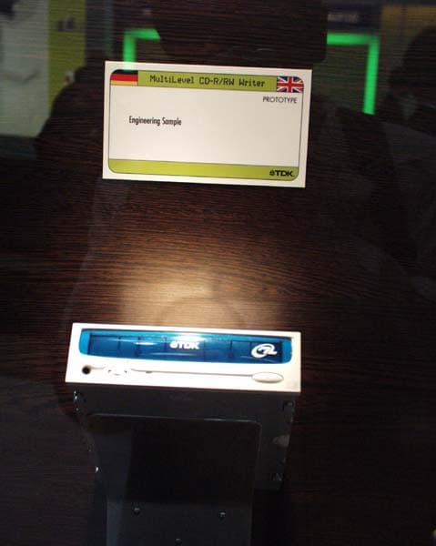 Демонстрацию проводил сотрудник Calimetrics. Из разговора с ним я выяснил, что, очевидно, компания TDK не будет выпускать ML-дисковод, предназначенный для работы с ML-CD, а сразу переключится на DVD, потому как это рынок они считают более перспективным. Также не исключена возможность, что компании, входящие в ML-альянс сразу сделают ставку на Blu-ray Disc. Ведь использование ML-технологии позволит добиться увеличения емкости Blu-ray-носителя с заявленных 27 Гбайт до 60 Гбайт! Вдумайтесь в эту цифру. 60 Гбайт на одном оптическом носителе. Впечатляет…