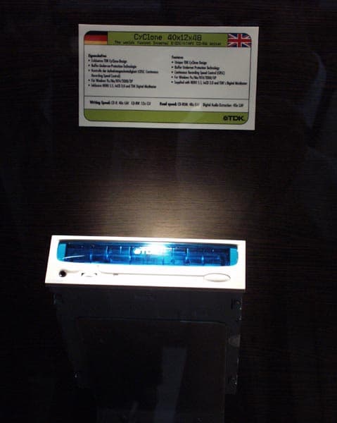 Компания TDK, один из ведущих мировых лидеров по производству аудио- и видеокассет, а также всего спектра носителей информации, не устраивала на своем стенде на CeBIT каких-либо феерических шоу или викторин, тем не менее, интерес к новым продуктам TDK был весьма ощутим и заметен. Думаю, нет нужды напоминать нашим читателям, что помимо носителей информации в арсенале компании присутствуют весьма популярные на нашем рынке рекордеры CyClone, а также новое направление деятельности компании — акустические системы и карты флэш-памяти.