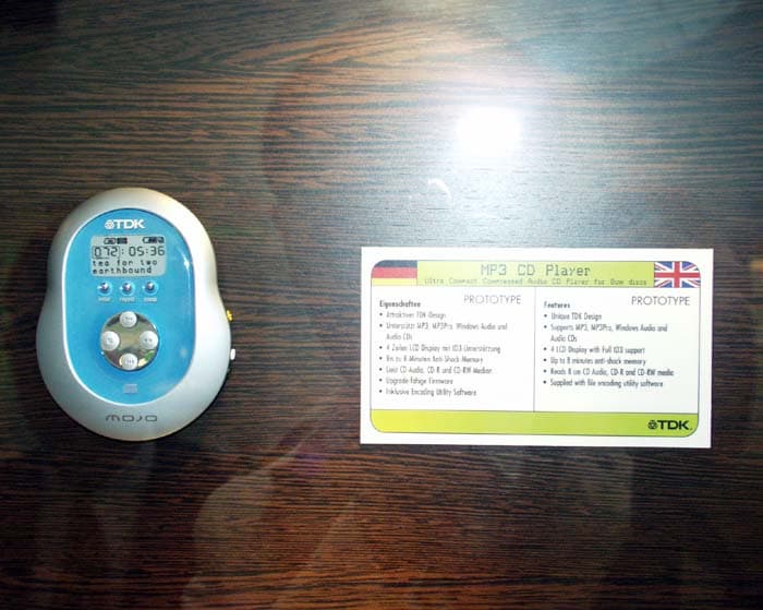 Если же вы до сих пор не обзавелись плеером, способным читать такие диски, то TDK предложит вам свой новый MP3 CD плеер Mojo. Ультра-компактный CD плеер для 8 см CD-дисков, выполненный в уникальном дизайне от TDK. Поддерживает форматы MP3, MP3Pro, Windows Audio и Audio CD. Плеер оснащен 4 см LCD-экраном с полной поддержкой ID3 и антишоковой функцией на 8 минут. Этот малыш способен работать как с 8 см дисками CD-R, так и CD-RW.