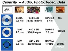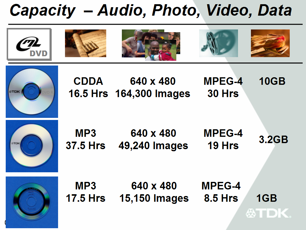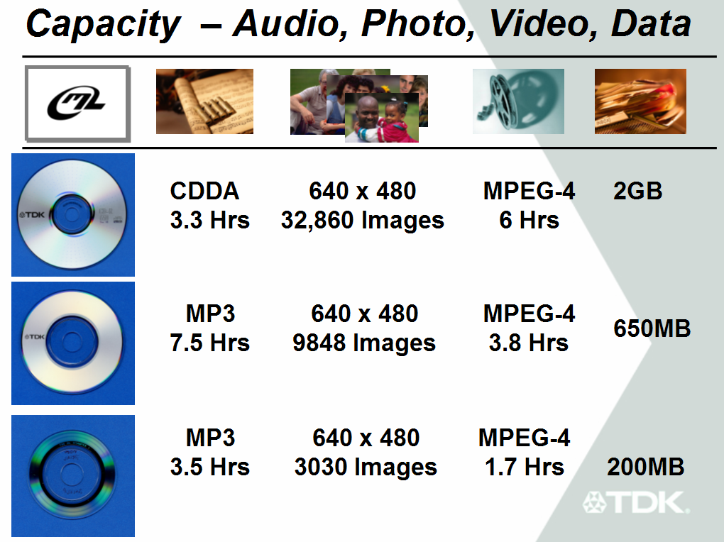 Пока же остается надеяться, что выпуск серийных моделей устройств не затянется, а носителей, предназначенных для записи на момент начала продаж будет достаточно для удовлетворения любого спроса. На CeBIT 2002 TDK представили образцы ML дисков разных диаметров, которые вмещают существенно больше информации, нежели аналогичные по размеру «обычные» CD носители.