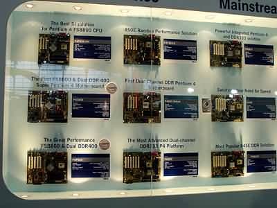 На стенде с платами под процессоры Intel Pentium 4 представлено великое разнообразие решений с поддержкой FSB 800 МГц. Нажав на фото, можно перейти к крупной фотографии и подробнее ознакомиться с характеристиками экспонатов.