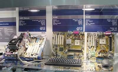 Ниже — экспозиция системных плат для платформы AMD K8. Как видите, компания полностью готова к появлению новых процессоров. На крупном снимке прекрасно видны названия плат и их характеристики.
