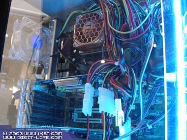 Излюбленная выставочная забава — показ систем на оверклокнутых процессорах. Однако экспозиция ASUS, на которой демонстрировалась такая система, заслуживает внимания хотя бы по той причине, что демонстрируемый на ней 3,06 ГГц Pentium 4, разогнанный более чем до 4 ГГц, работает не с каким-либо водяным охлаждением, а с обычным медным кулером от Thermaltake. Вот такая интересная система: