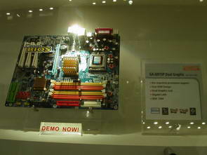 Gigabyte для многих, в первую очередь, ассоциируется с материнскими платами. И это, наверное, вполне объяснимо. Следовательно, начнем наше ознакомление со стендом Gigabyte, с флагманов серии — плат на Intel 955 максимально навороченной серии Royal и 945 серии Pro.