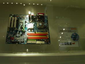 Обратимся к стенду DFI. Вендор продолжает эксплуатировать успешную серию LanParty — стильные материнские платы, элементы которых светятся в ультрафиолете. Вот и новые платы, такие как nForce 4 SLI для процессоров AMD и Intel, DFI также выпустила в линейке дорогих плат LanParty.