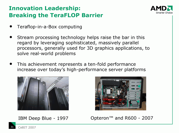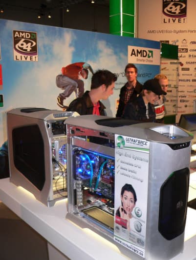 Лишь AMD, которой на этот раз пришлось «отвечать» и за ATI, проявила заметную активность. Впрочем, по сравнению с предыдущими годами (2005 и 2006), когда стойками и кубиками AMD были уставлены стенды компаний-партнеров в доброй половине павильонов, а собственный стенд AMD представлял собой «кубик» особо больших размеров, служивший «переговорной» для деловых встреч и интервью, на этот раз оба стенда AMD допускали и простых посетителей.