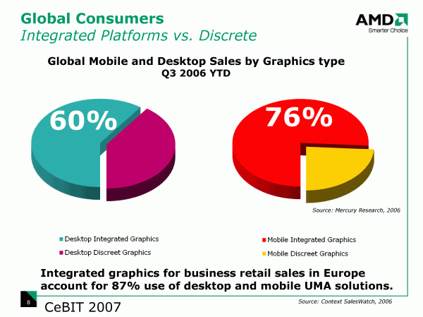 Из «чипсетной» части презентации приведем лишь несколько слайдов, здесь в центре внимания недавно выпущенный AMD 690G, и не только потому, что свеж, как продукт. Но и по той причине, что интегрированная графика это «важно», поскольку 60% настольных компьютеров и 76% ноутбуков комплектуются именно ею, а среди офисных компьютеров этот показатель еще выше.
